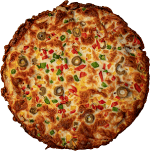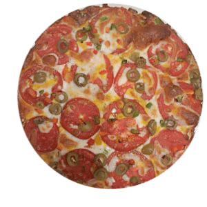 خمیر پیتزا آمریکایی، سس مخصوص، گوجه، پنیر پیتزا، زیتون، فلفل دلمه ای