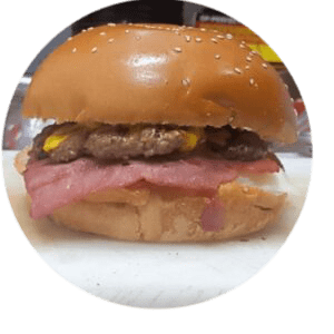 برگر دست ساز گوشت گوساله ۱۵۰ گرمی، بیکن گوشت ۹۷%، پنیر گودا ورقه ای، گوجه، خیارشور، کاهو، سس مخصوص، نان گرد