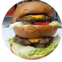 ۲ عدد برگر دست ساز گوشت گوساله ۱۵۰ گرمی، پنیر گودا، گوجه، خیارشور، کاهو، سس مخصوص، نان گرد