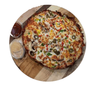 خمیر پیتزا آمریکایی، شنسل مرغ گریل، پنیر پیتزا، قارچ، فلفل دلمه ای، زیتون، سس مخصوص