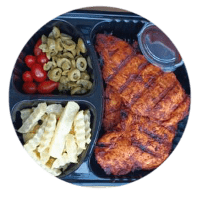 ۴۰۰ گرم شنیسل گریل شده، دورچین: سیب زمینی، زیتون، گوجه، سس باربیکیو